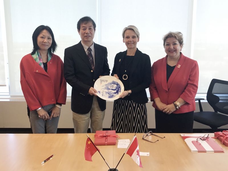 5月8日,代表团访问了加拿大约克大学,与该校常务副校长丽莎•菲利普斯(Lisa Philipps)、副教务长理查德•黄(Richard Ooi)、助理副校长玛丽莲兰•伯特-杜发奇(Marilyn Lambert-Drache)、助理副校长特雷西•泰勒-欧雷利(Tracey Taylor-O’Reilly)及相关项目负责人进行了会谈。双方就两校将要开展的“3+1研究生文凭项目”进行了充分讨论,并就人力资源管理、会计、商业管理等三个研究生文凭项目达成了初步合作意向。双方还在暑期课程、研究生共同培养、法学院合作、开展计划外招生等方面进行了热烈讨论,达成了诸多合作意向。聂培尧与丽莎•菲利普斯共同签署了两校战略合作备忘录。