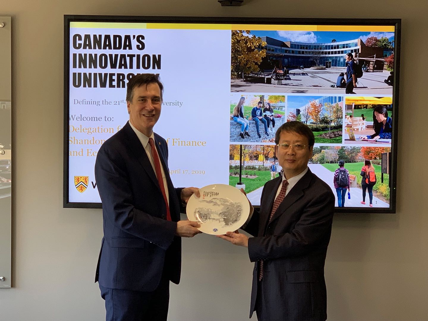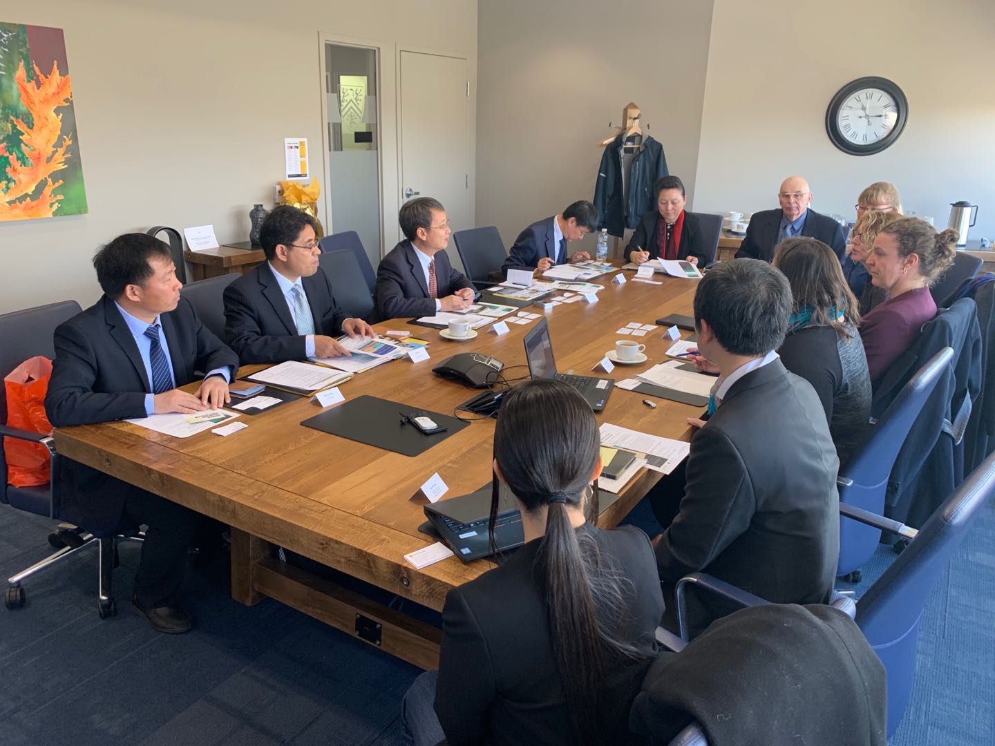 在加拿大滑铁卢大学,该校副校长伊恩•罗兰兹博士(Ian Rowlands)、文学院副院长罗伯特•帕克先生教授(Robert Park)、环境学院副院长布伦登•拉森教授(Brendon Larson)以及将赴我校授课的合作教师等,先后十余人依次与我校代表团进行了会谈。双方就已开展的“2+2本科双学位项目”进行了总结和评估,并就相关细节进行了进一步对接,双方一致同意将扩大我校赴滑铁卢大学学生的名额,同时就选拔我校优秀本科生参加对方学校直博项目进行了探讨。随后,与环境学院对申报环境经济学专业合作办学项目进行了充分交流,针对课程设置、授课形式、授课时间等进行了磋商,制定了时间进度表,与将要来授课的教师一一见面。
