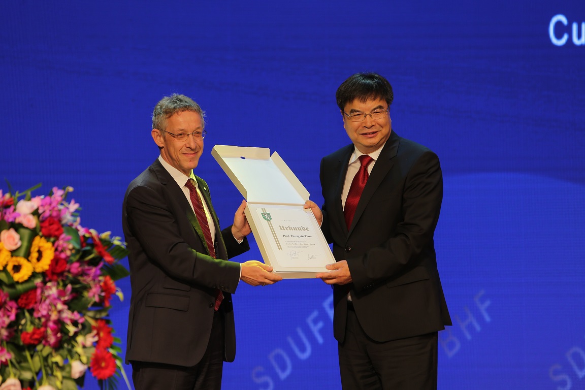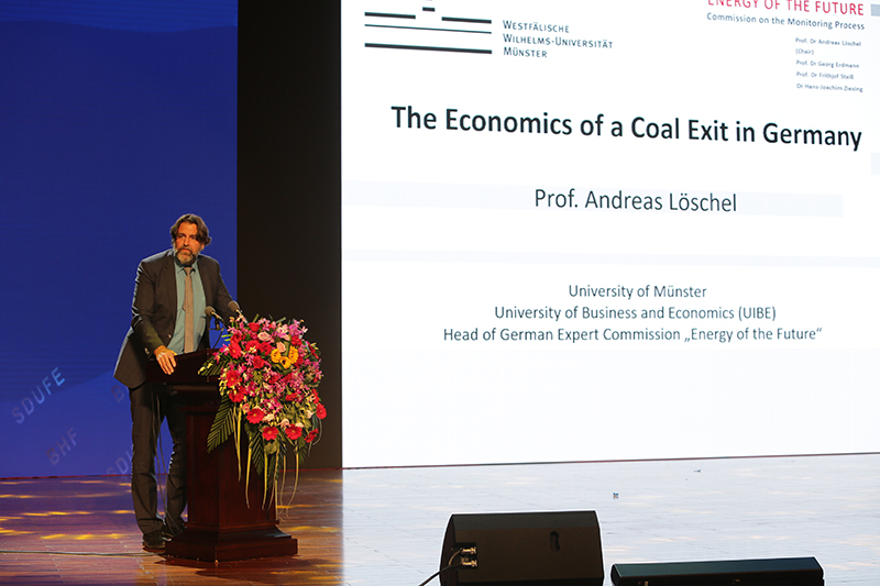 嘉宾致辞后,德国哈勒大学柔斯特教授客座教授授予仪式举行。王邵军为柔斯特颁发聘书,柔斯特接受证书鲜花并发言。褚安思为赵忠秀颁发委任证书,委任其担任奥地利斯泰尔市城市大使。随后,北京洪堡论坛创始成员、德国科学与工程院院士、德国明斯特大学吕安迪教授作题为《德国的“退煤”经济学》的主旨演讲。