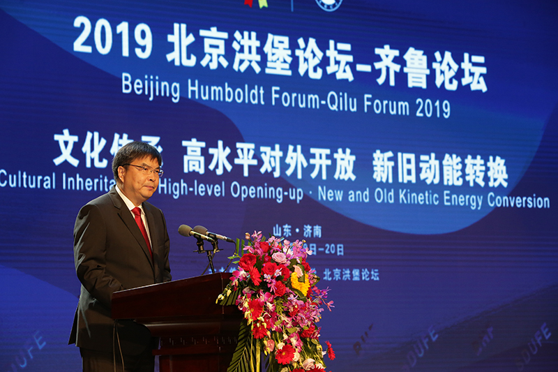 王邵军在致辞中对来自海内外的嘉宾表示欢迎和感谢,并简要介绍了山东省和学校的基本情况。他强调,近年来,山财大把国际化办学作为推动内涵式发展的重要战略,与加拿大、新西兰、美国、英国、法国、日本等国家的60余所高校和教育机构建立了多层次、多形式、实质性的交流合作关系。他指出,近年来,山东省紧紧围绕新发展理念,深入推动新旧动能转换重大工程,积极培育“政产学研金服用”共同体,高质量发展全面起势,呈现出欣欣向荣的景象。北京洪堡论坛作为社会各界领袖交流思想、扩大合作、实现全球化经济与文化可持续发展的高端平台,走出北京来到齐鲁大地恰逢其时。他期望各位专家学者和各界精英人士能够充分交流、深入探讨、集思广益、增进友谊,将本次论坛办成推动学术创新、促进交流合作、实现共赢发展的盛会。