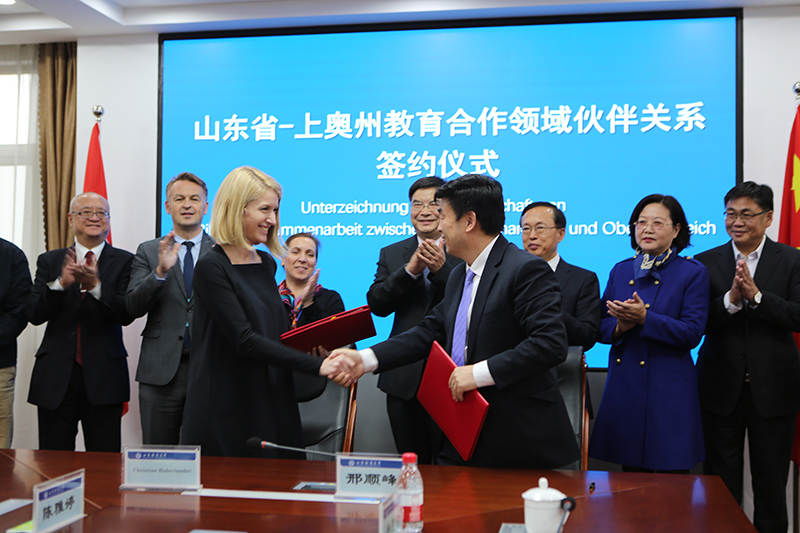 山东省教育厅总督学邢顺峰与副州长克里斯蒂娜·哈博兰德签署了山东省-上奥州教育合作领域伙伴关系备忘录。座谈会后,赵忠秀校长接受了奥地利上奥州媒体记者的采访,就下一步两省州教育领域的合作等问题发表了见解。