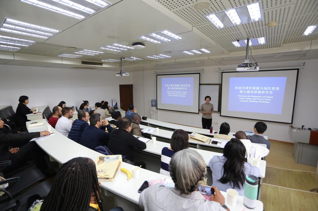 全球价值链与绿色贸易能力建设研修班由中华人民共和国商务部主办,对外经济贸易大学承办,学员为“一带一路”沿线发展中国家司处级贸易领域相关官员及企业高级管理人员,旨在配合“一带一路”倡议、2030年可持续发展目标,为相关发展中国家应对气候变化,发展绿色价值链及其相关的经贸、产业、环境等提供理论支持和实践引导,并将相关培训成果在联合国平台分享。