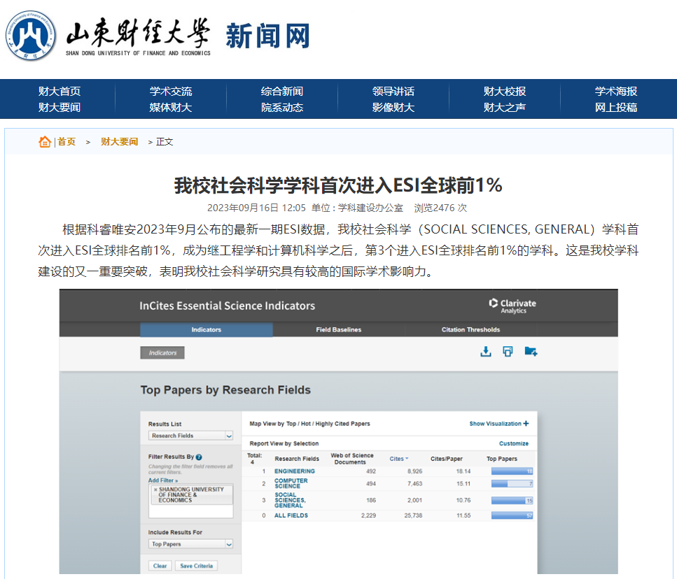 3.学科建设和研究生教育取得新进展。在2023软科中国最好学科排名中,应用经济学和管理科学与工程学科排名进入全国前12%,工商管理学科进入全国前20%,均居省属高校第一位。社会科学学科首次进入ESI全球排名前1%,成为继工程学和计算机科学之后,第3个进入ESI全球排名前1%的学科。统计学一级学科博士点顺利通过教育部学科评议组专项核验。“乡村振兴学”二级交叉学科通过教育部审核备案,成为国内首个“乡村振兴学”二级交叉学科。“公共政策与管理”交叉学科博士点通过教育部审核备案。马克思主义学院入围全省重点马院立项建设名单。获教育部学位中心立项案例5项,位居省属高校第1位、全国财经类院校并列第2位。作为山东省唯一高校入选教育部案例研究基地首席专家依托单位,“鲁商文化系列课程”入选“中国MBA十佳品牌活动”。