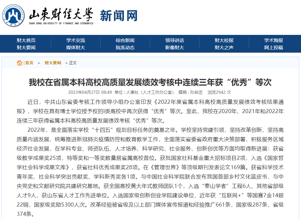 6.高层次人才队伍实现新突破。新增获批“管理科学与工程”“统计学”两个博士后科研流动站。全年引进高水平人才89人,其中省部级人才6人。彭红枫担任负责人的金融学教师团队入选第三批“全国高校黄大年式教师团队”。关洪军等9人入选“泰山学者”建设工程计划。毕继东获全国高校教师教学创新大赛一等奖,国赟获二等奖。“刘培德劳模创新工作室”入选首批山东省教育系统劳模和优秀人才创新工作室。