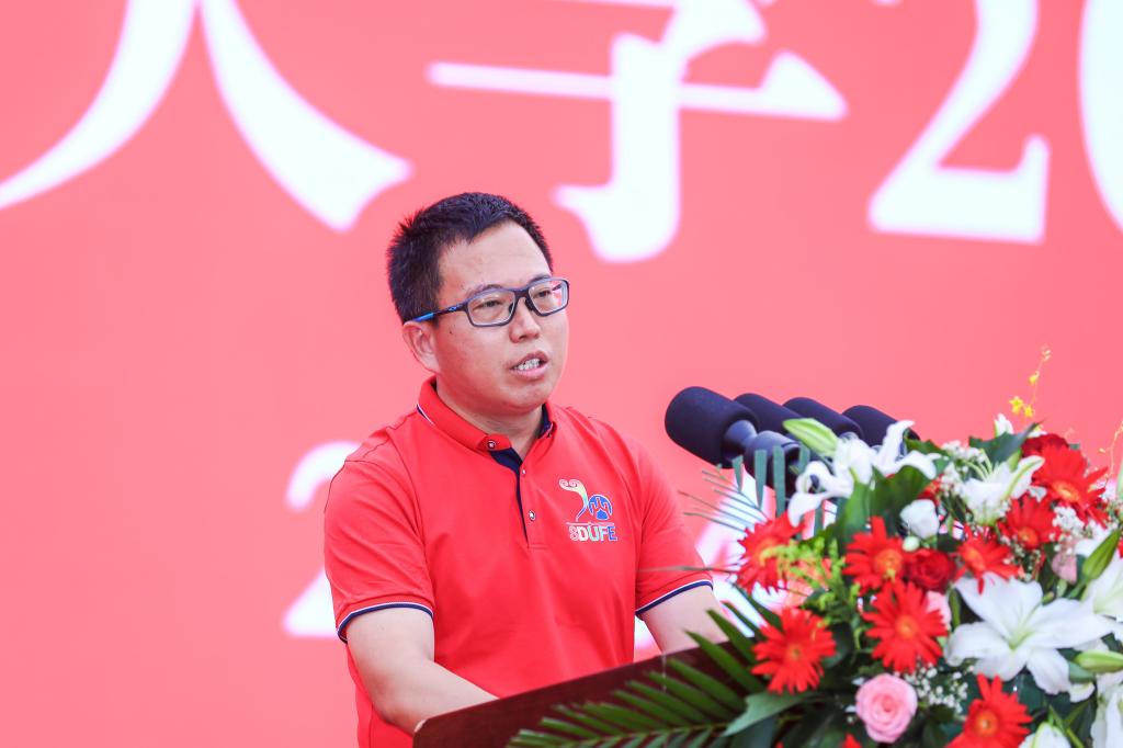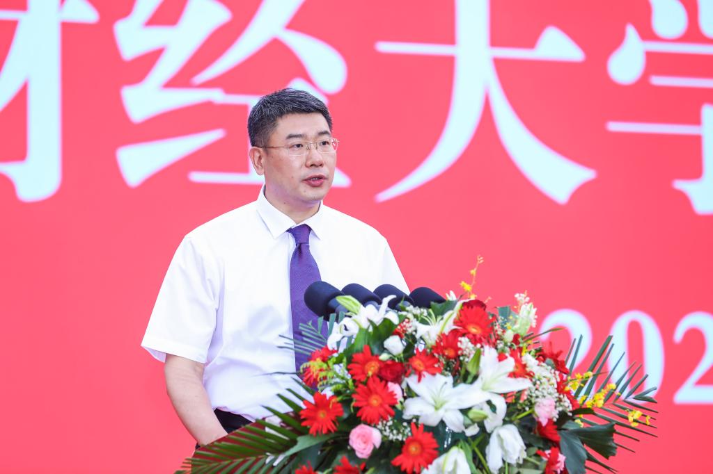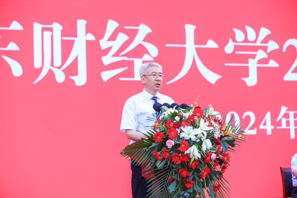在热烈的掌声中,洪俊杰发表讲话。他向全体毕业生表示热烈的祝贺,向为学生成长成才倾注心血的师长、亲人和朋友致以崇高的敬意,向一直以来关心财大、爱护财大、支持财大的各位家长、校友和社会各界人士表示衷心的感谢,深切寄语毕业生们“跨越山海,逐梦未来”。