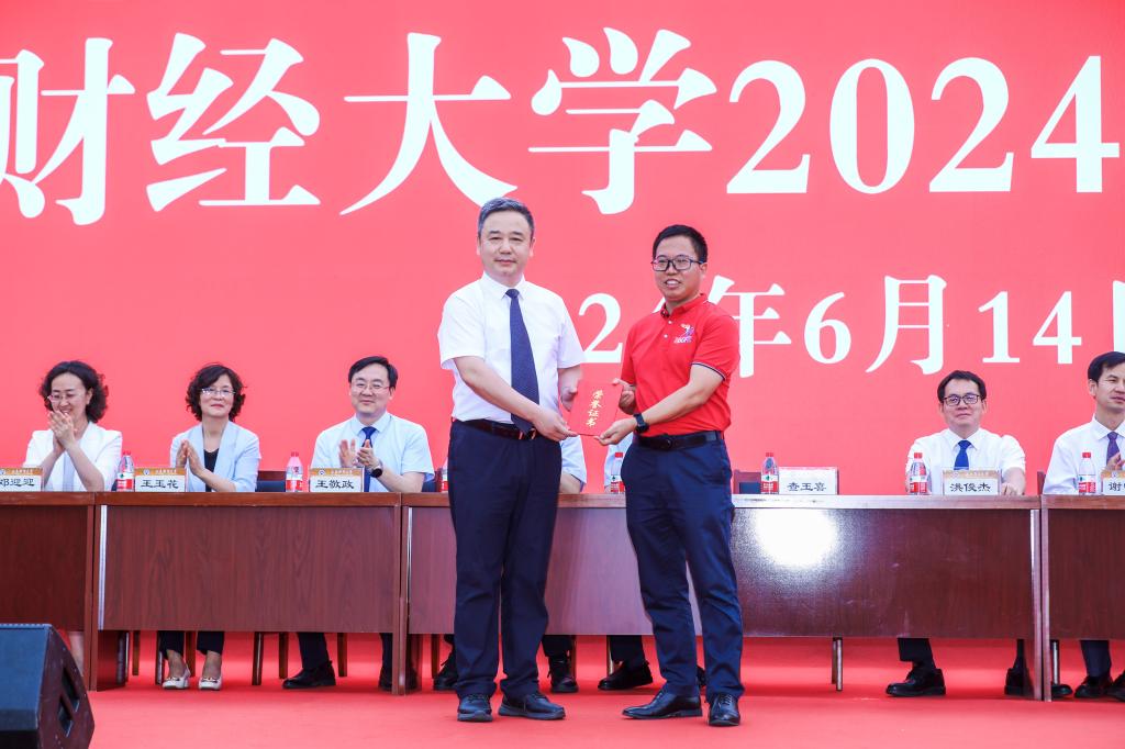 查玉喜为1992级投资经济专业校友、中海资本创始合伙人寇祥河颁发“杰出校友证书”。寇祥河作为校友代表致辞,对学弟学妹的顺利毕业表示热烈祝贺,对母校、恩师的培养表示真诚感谢。他分享了自己在投资领域创业的经历,勉励毕业生们守住本心、保持乐观、持续学习、懂得感恩。