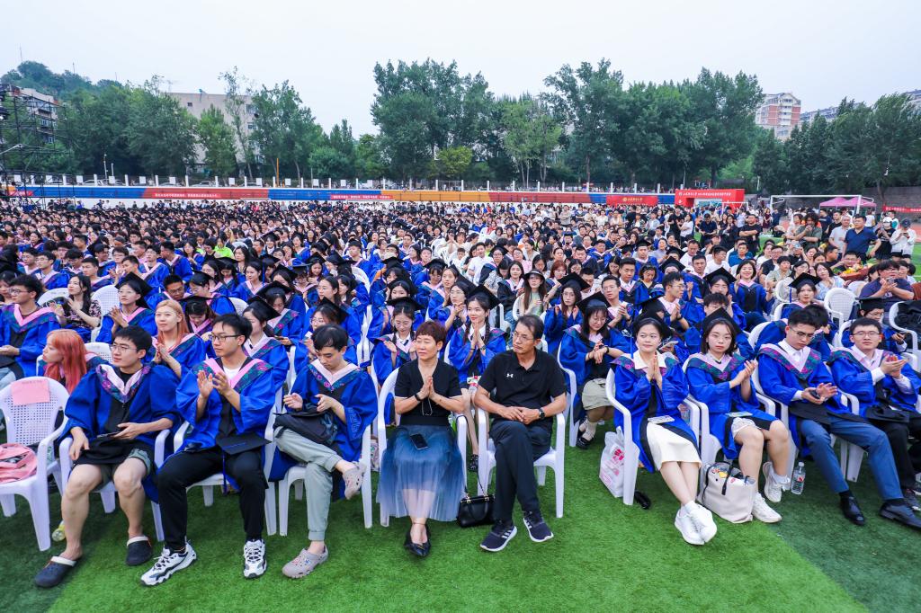 今年的毕业典礼温馨感人的细节随处可见。学校首次将毕业典礼安排在运动场举行,以容纳更多毕业生见证参与;为避免高温炎热,毕业典礼自傍晚开幕,延续至晚9点结束;燕山校区运动场东南侧搭建的红色拱门、铺设的红毯,还有校园内随处可见、饱含祝福的条幅展板,为这场盛会增添了满满的仪式感,吸引了毕业生及其亲友频频合影留念,共享喜悦。