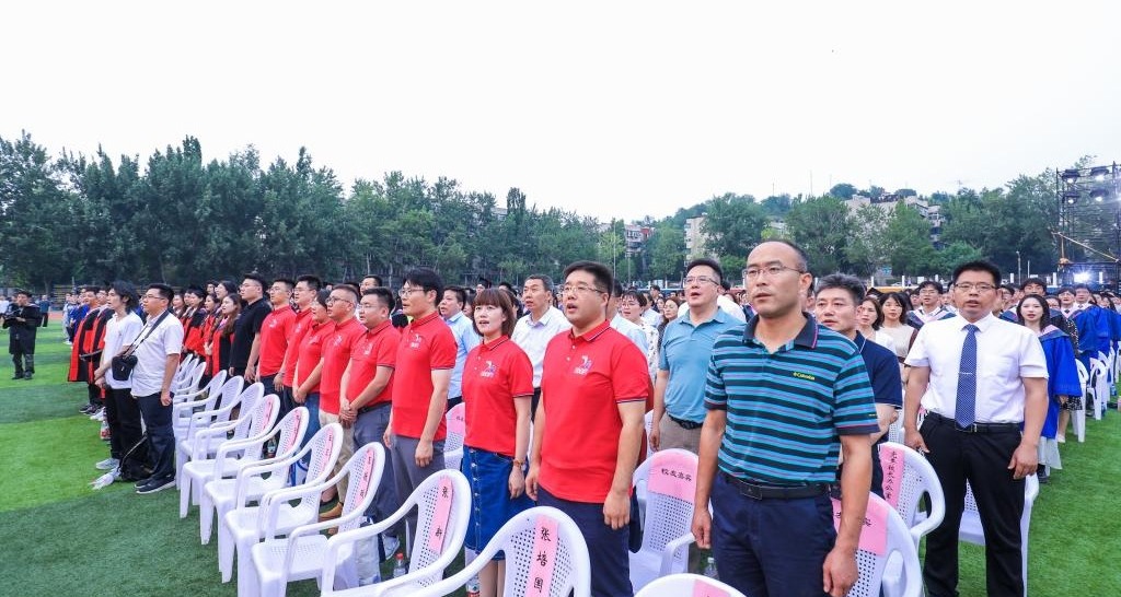 傍晚6时许,毕业典礼在国歌声中拉开帷幕,全体师生起立高唱国歌。