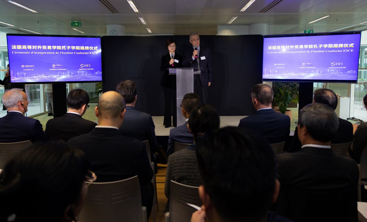 中国国际中文教育基金会副理事长、秘书长赵灵山线上致辞,山东财经大学校长洪俊杰、法国高等对外贸易学院校长克里斯托夫・布瓦索出席仪式并致辞。仪式由孔子学院中方院长解玲和法方院长李建乐共同主持。