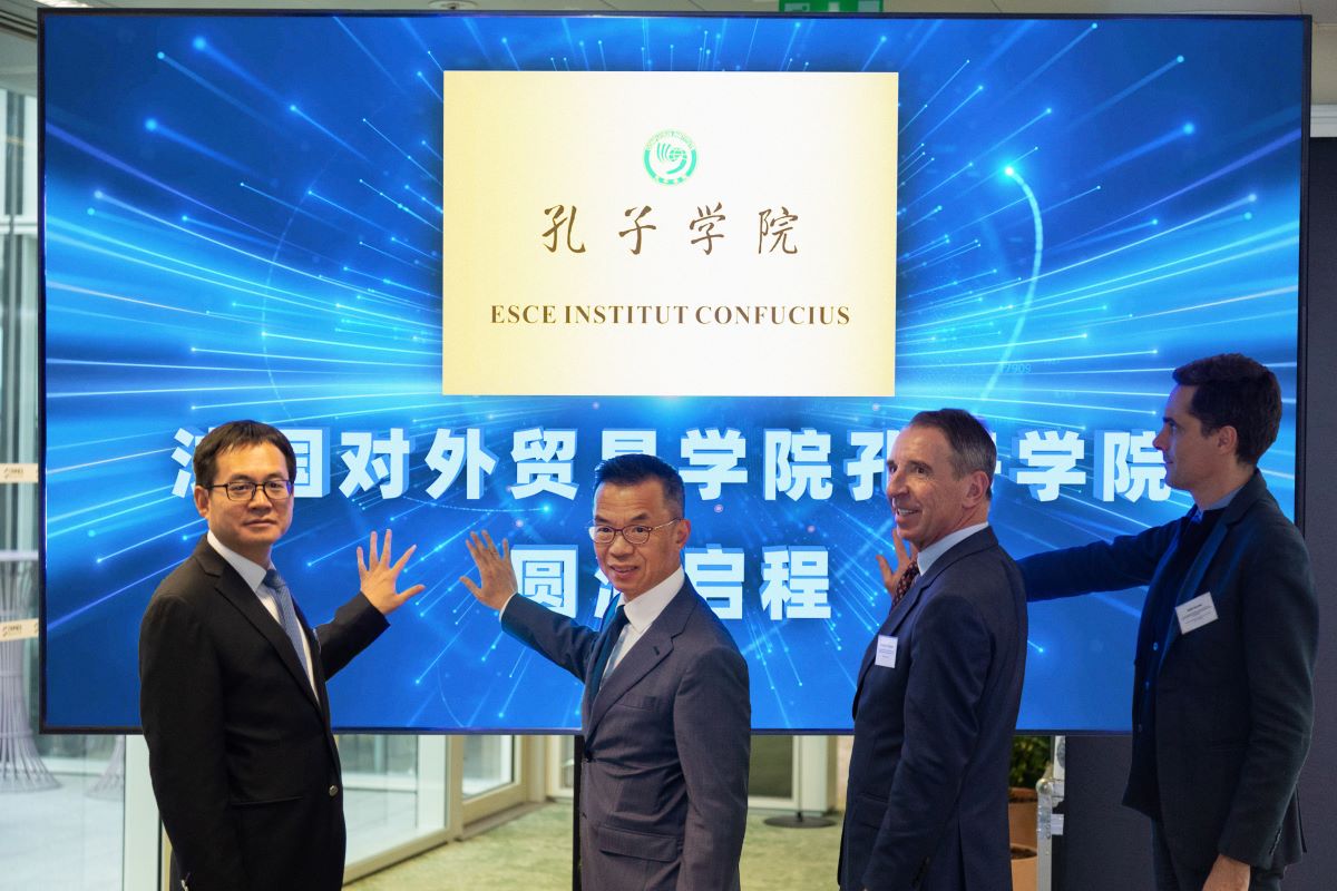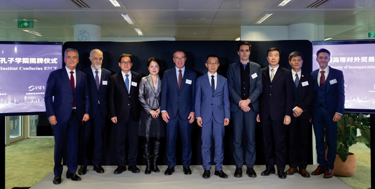 法国巴黎时间12月6日下午,我校与法国高等对外贸易学院共建孔子学院揭牌仪式在巴黎举行。中国驻法国大使卢沙野,法国国民教育部教育、体育和科研总督学兼汉语总督学尼古拉·易杰,巴黎库尔泊瓦市长雅克・科索夫斯基,法国中国工商会会长、中国银行巴黎分行行长肖亮,中国驻法国大使馆教育公使衔参赞周家贵,中国贸促会法国代表处副总代表李文国,法亚协会主席让马力·卡姆巴塞尔等出席仪式。